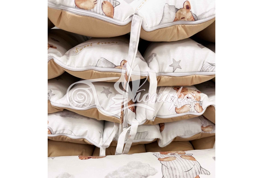 • Бортик-заборчик стеганый с синтепоном, плотно забит синтепухом (на замочках): - 2 шт. 60х34 см / - 2 шт. 120х34 см.